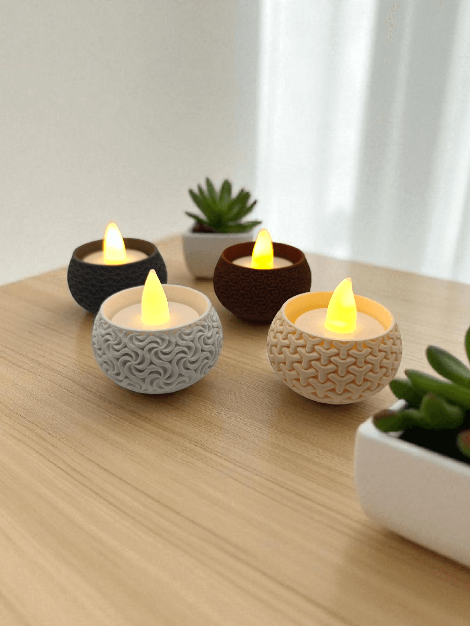 Brighten your space with our 3D Printed Geometric Tealight Holders. Featuring intricate patterns and cozy LED candlelight, these holders are perfect for adding a modern, artistic touch to your home or office.